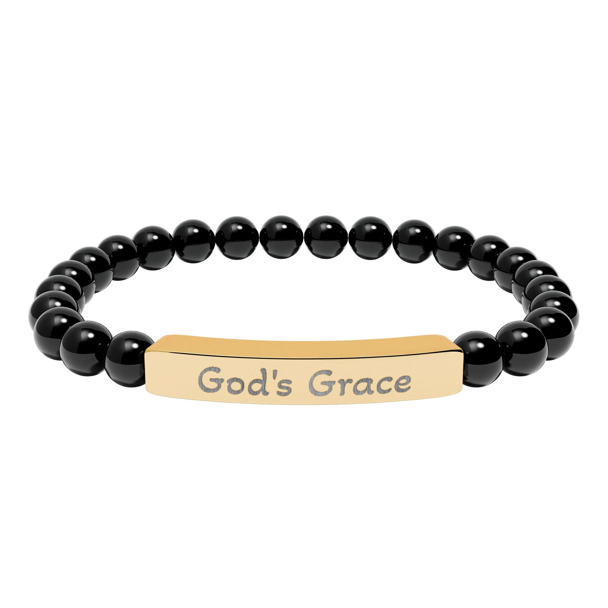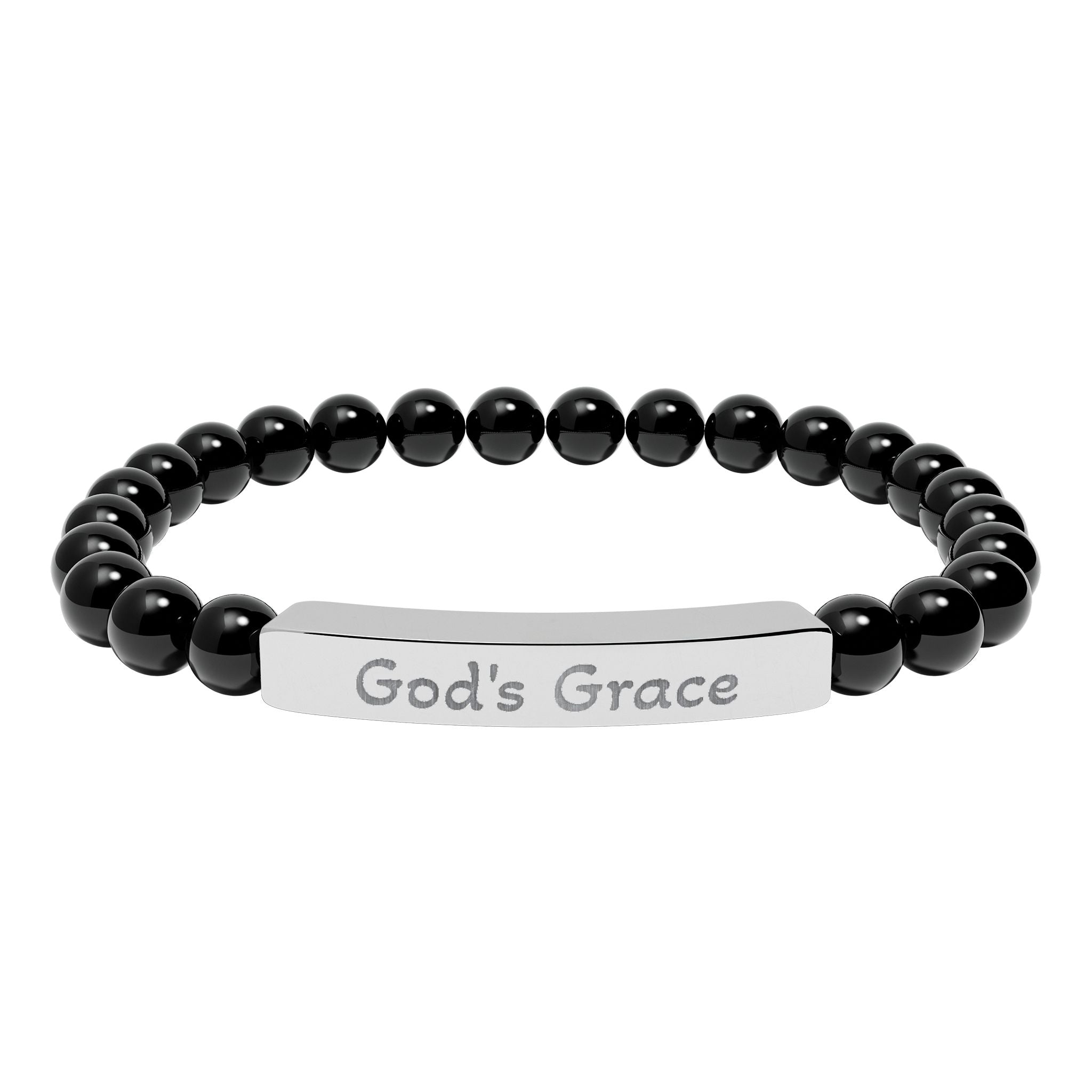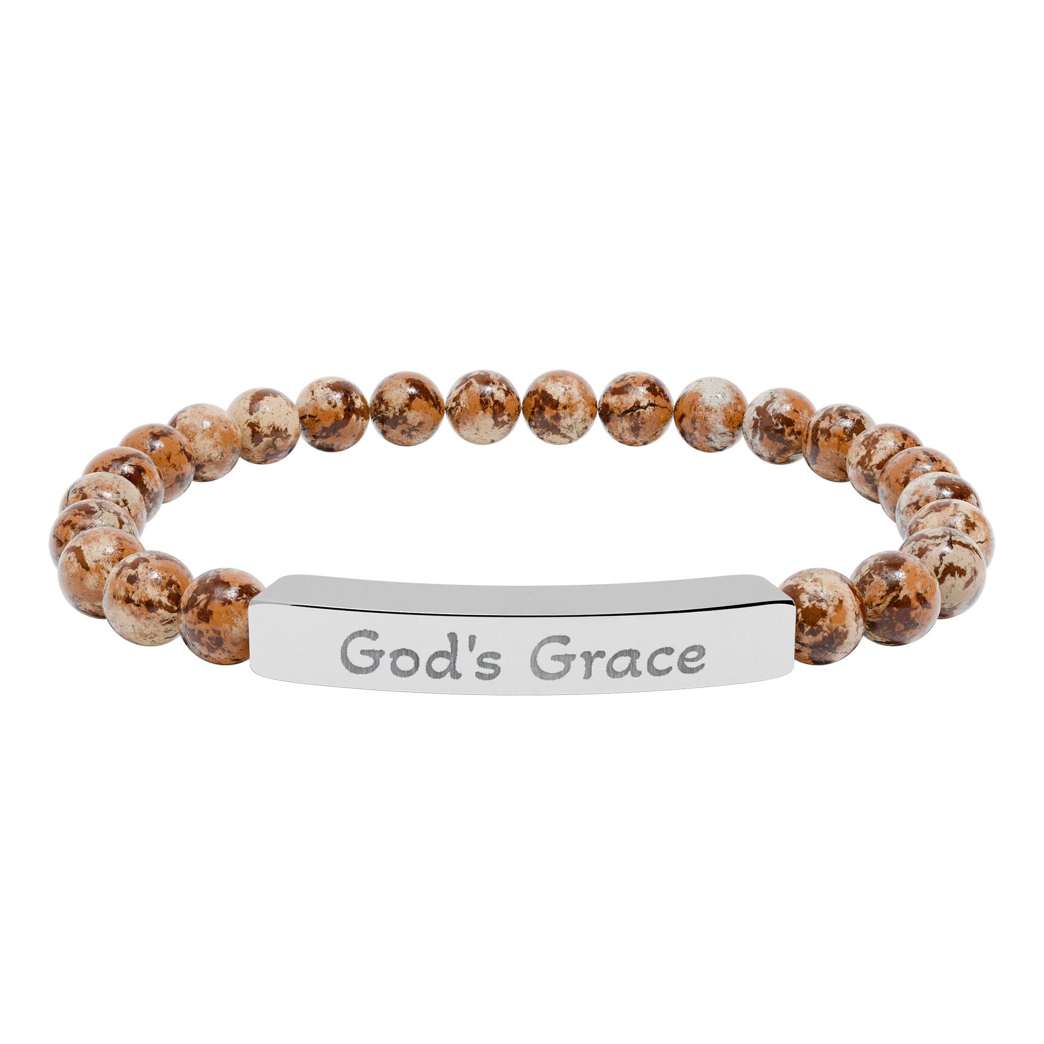 A calming, grounded bracelet that blends natural stone beads with a sleek engraved stainless steel bar. Each smooth bead carries subtle, earthy tones that catch the light softly, while the engraved plate — marked with the message God’s Grace — rests gently on the wrist as a quiet reminder of faith and protection. Lightweight and stretchable, it slips on easily and pairs effortlessly with everyday wear or moments of reflection. Packaged in a white gloss jewelry box with non-tarnish cotton fiber, it arrives ready to be treasured or gifted as a meaningful, thoughtful token.