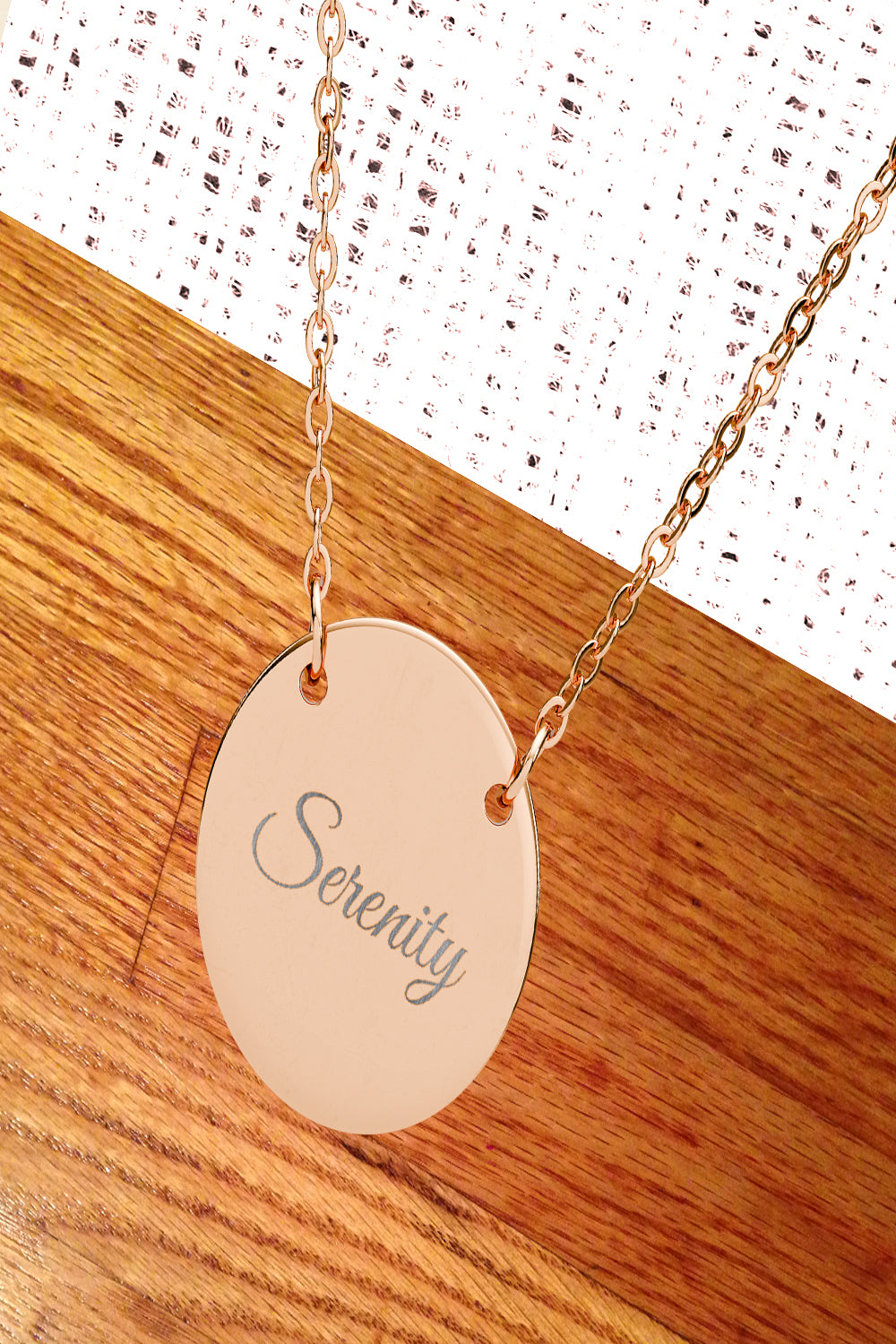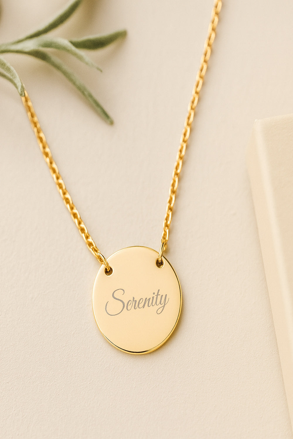 A simple, calming circle necklace engraved with the word “Serenity.” Lightweight and low-profile, it sits close to the collarbone for everyday wear. The disk’s clean, laser-etched lettering gives a subtle, handcrafted feel that doesn’t shout — it reminds. Made from 316L surgical-grade stainless steel with an optional PVD finish in silver or warm rose gold tones, the piece resists rust and keeps its sheen. The delicate chain fastens with a sturdy lobster clasp for secure daily wear. Wear it alone for a quiet, meditative accent or layer it with other chains to build a personal stack that carries intention.